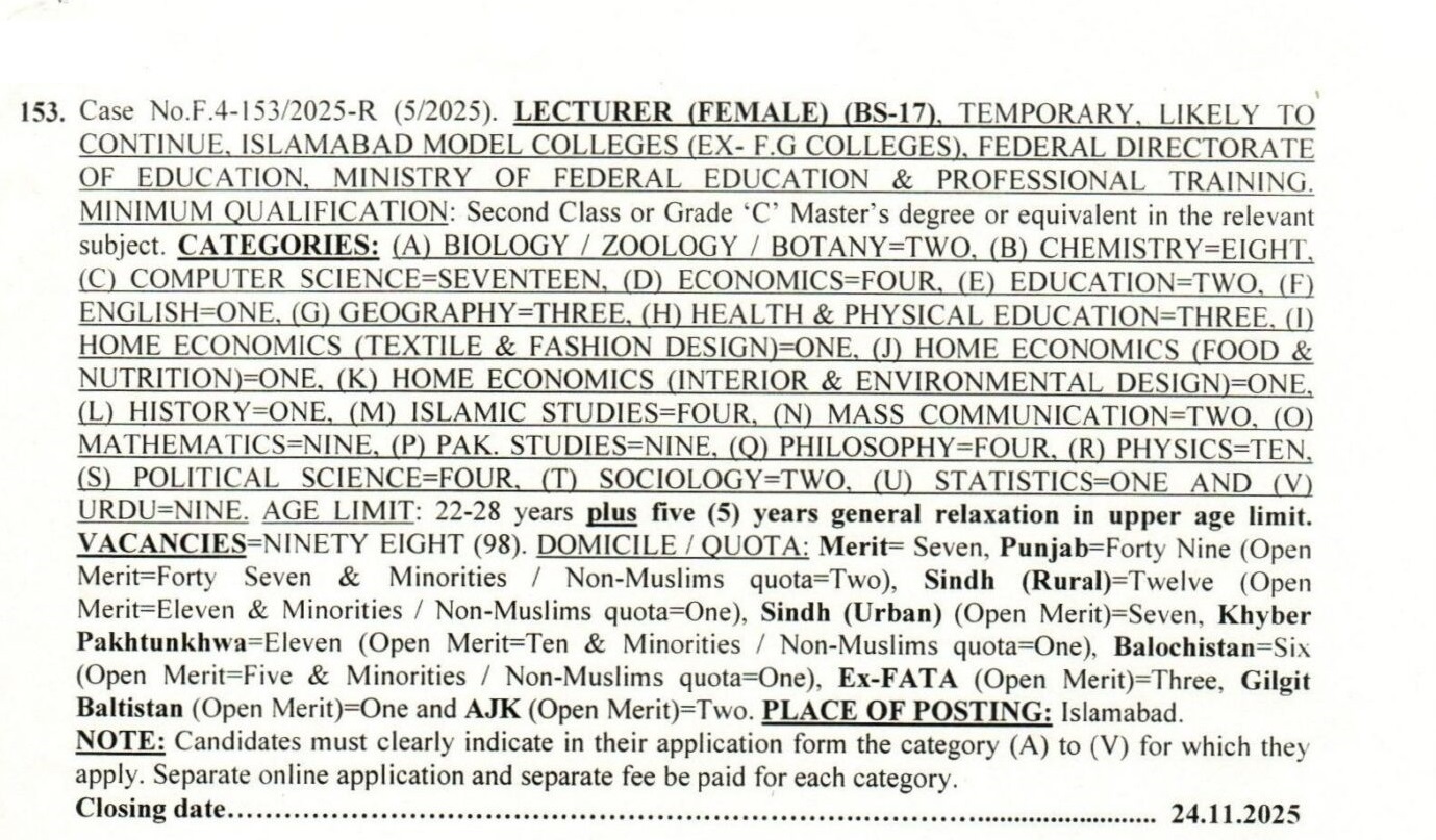FPSC Lecturer Jobs 2025 Apply Online Federal Directorate of Education FDE Advertisement Job Ad shown on this page is taken from The News Newspaper on 09-11-2025