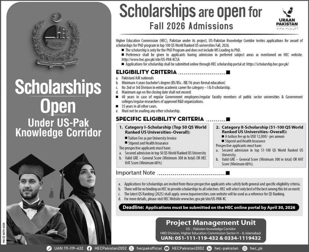 HEC Scholarships 2026 Apply Online US-Pak Knowledge Corridor PhD Program in US Universities Job Ad shown on this page is taken from Express Newspaper on 16-11-2025