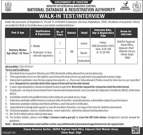 Advertisement of NADRA Jobs 2025 for Sanitary Workers in Gilgit Baltistan Walk-In Test / Interview-295306