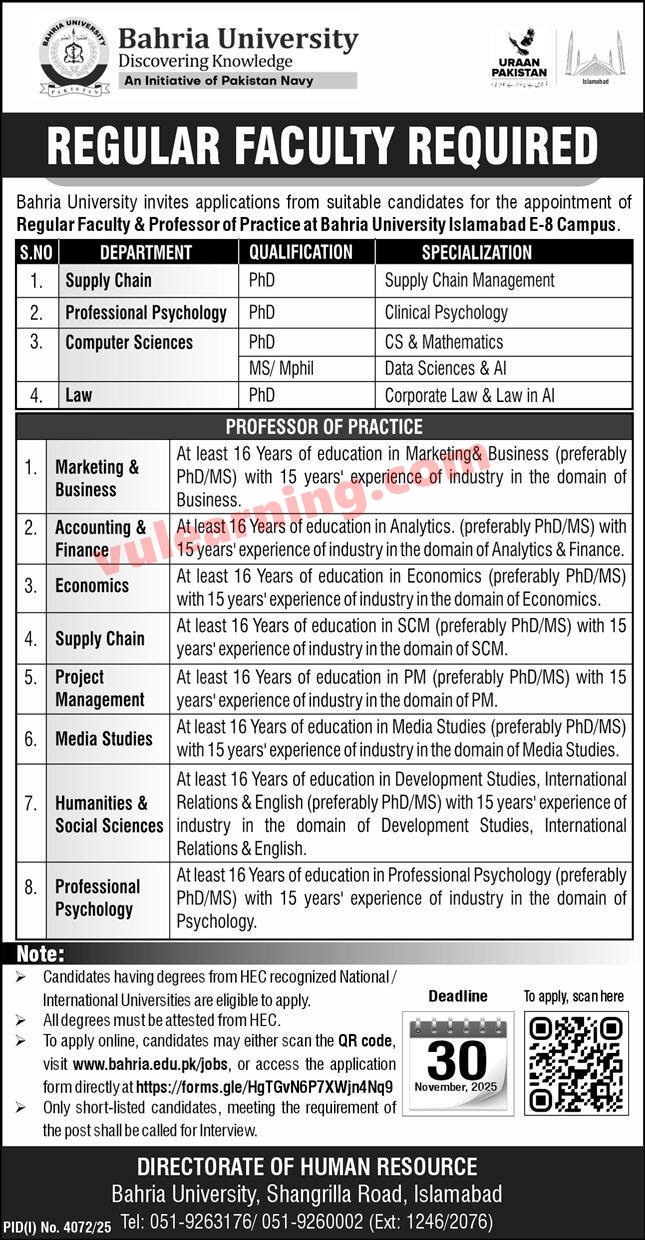 Bahria University Islamabad Jobs 2025 Apply Online for Teaching Faculty Latest Job Ad shown on this page is taken from The News Newspaper on 16-11-2025