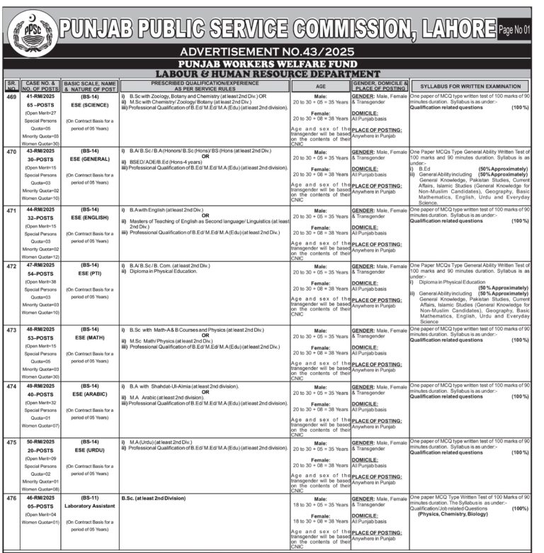 Advertisement of PPSC Jobs 2025 for Educators (ESE) BPS-14 in Govt Schools Apply Online Advertisement-295315
