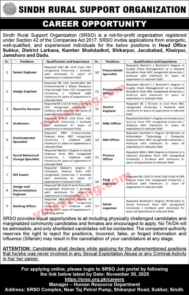 Sindh Rural Support Organization SRSO Jobs 2025 Apply Online for Field Engineer, Social Organizer & Others Latest Job Ad shown on this page is taken from Express Newspaper on 23-11-2025