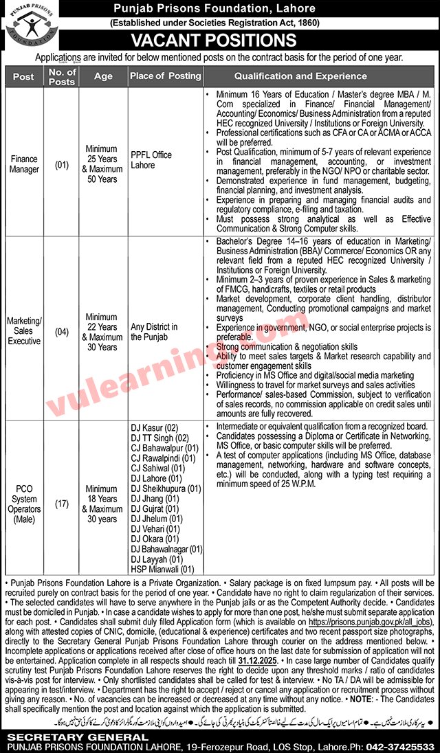 Advertisement of Punjab Prisons Foundation Jobs 2025 for PCO System Operators, Marketing / Sales Executives & Finance Manager-295334