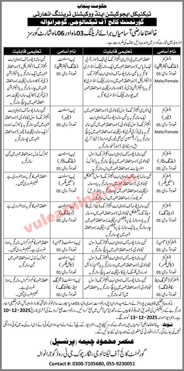 TEVTA Jobs 2025 for Instructors & Lab Assistants at Government College of Technology Gujranwala Job Ad shown on this page is taken from Express Newspaper on 27-11-2025