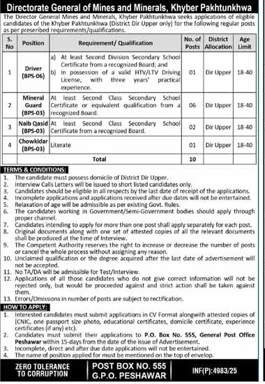 Advertisement of Mines & Minerals Department KP Jobs 2025 for Guards, Naib Qasid & Others-295350