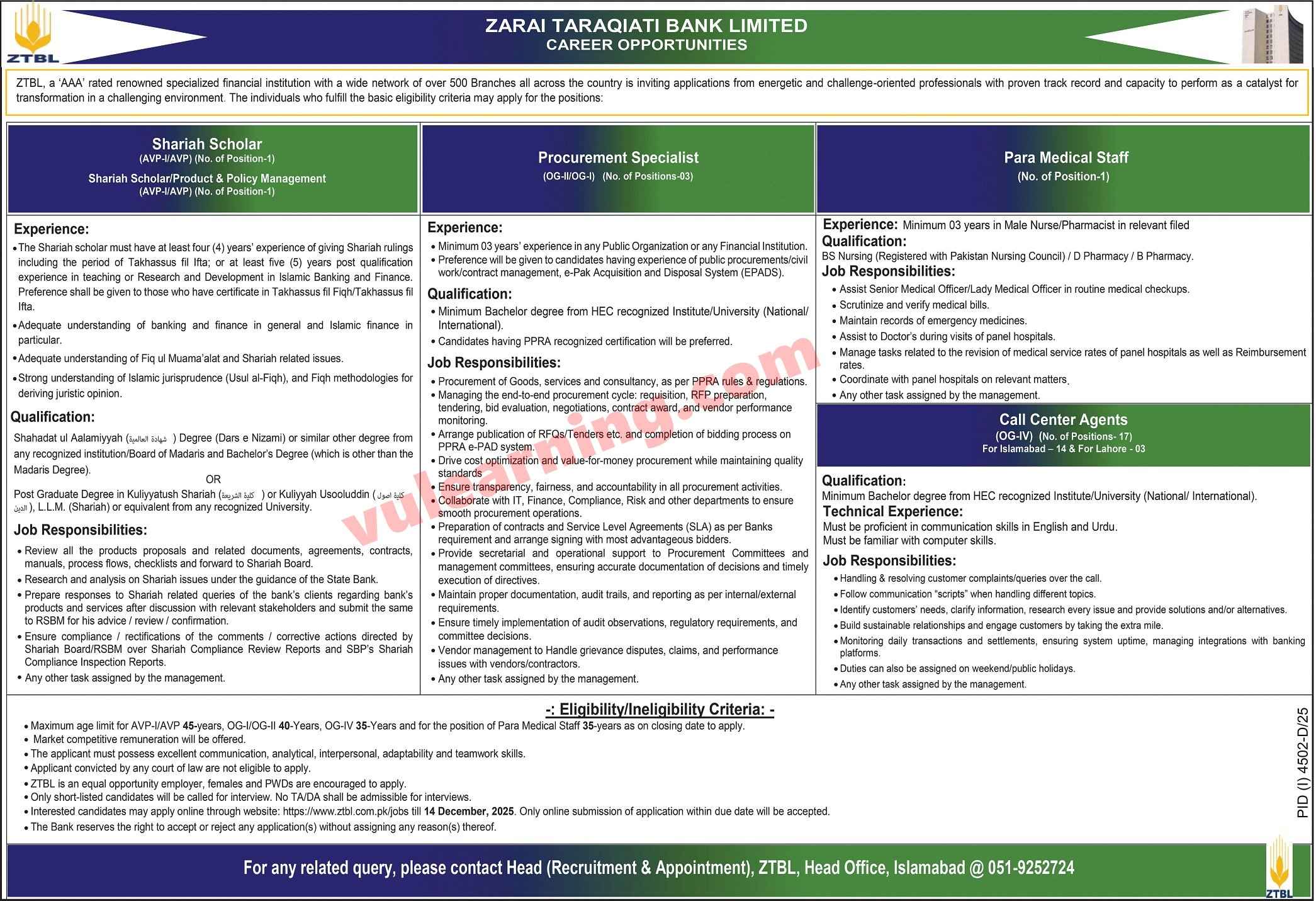 ZTBL Jobs 2025 Apply Online for Call Centre Agents & Others Zarai Taraqiati Bank Limited Job Ad shown on this page is taken from Jang Newspaper on 30-11-2025