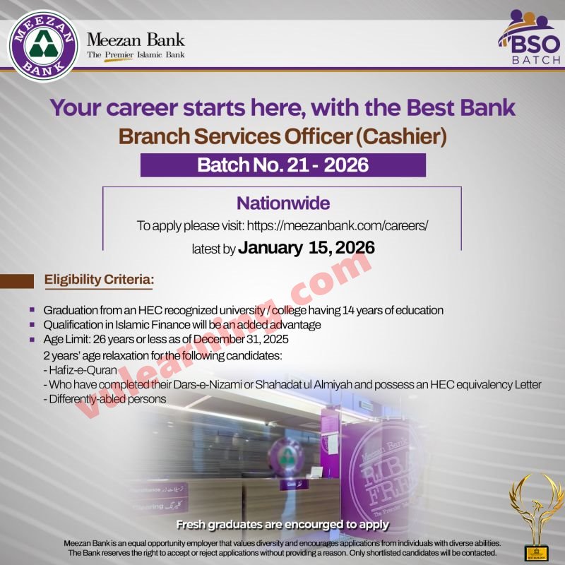 Advertisement of Meezan Bank Jobs 2026 for Branch Service Officers (Cashier's) BSO Batch 21 Apply Online-295404