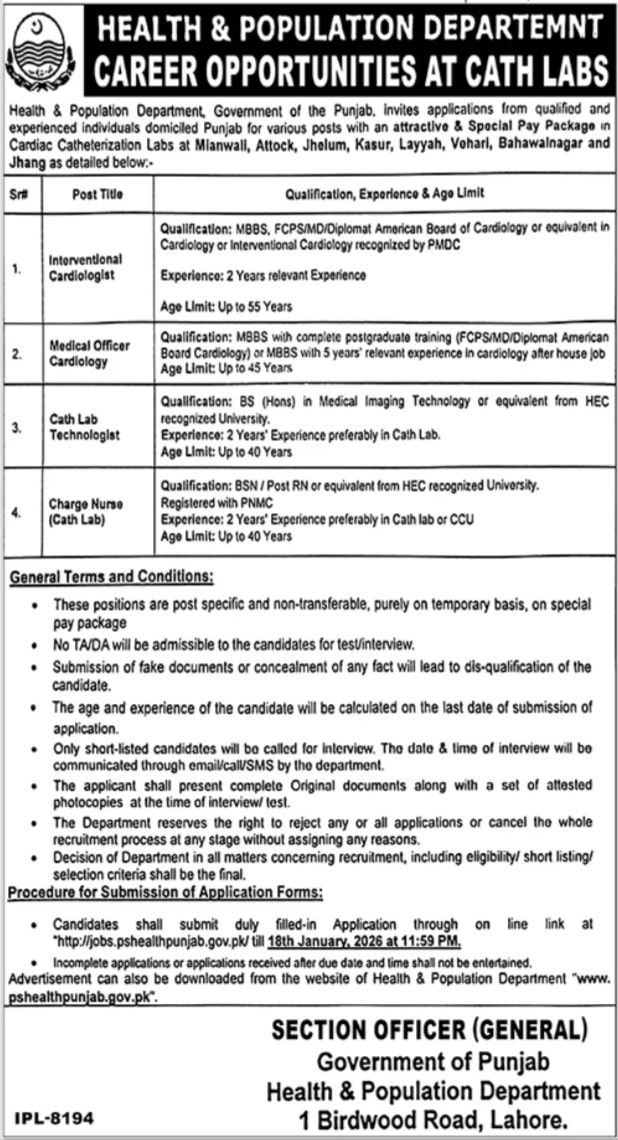 Health & Population Department Punjab Jobs 2026 for Cath Labs in Multiple Districts Job Ad shown on this page is taken from Jang Newspaper on 01-01-2026