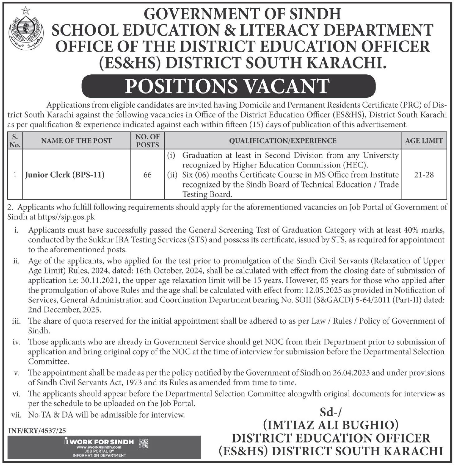 School Education & Literacy Department Sindh Jobs 2026 for 66 Junior Clerks Apply Online Job Ad shown on this page is taken from Express Newspaper on 01-01-2026