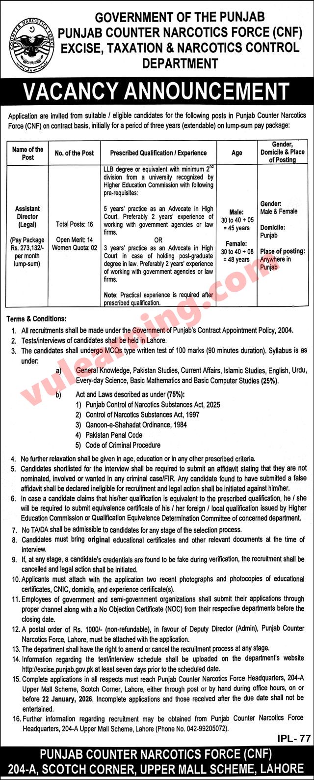 Punjab Counter Narcotics Force CNF Jobs 2026 Excise, Taxation & Narcotics Control Department Job Ad shown on this page is taken from Jang Newspaper on 04-01-2026