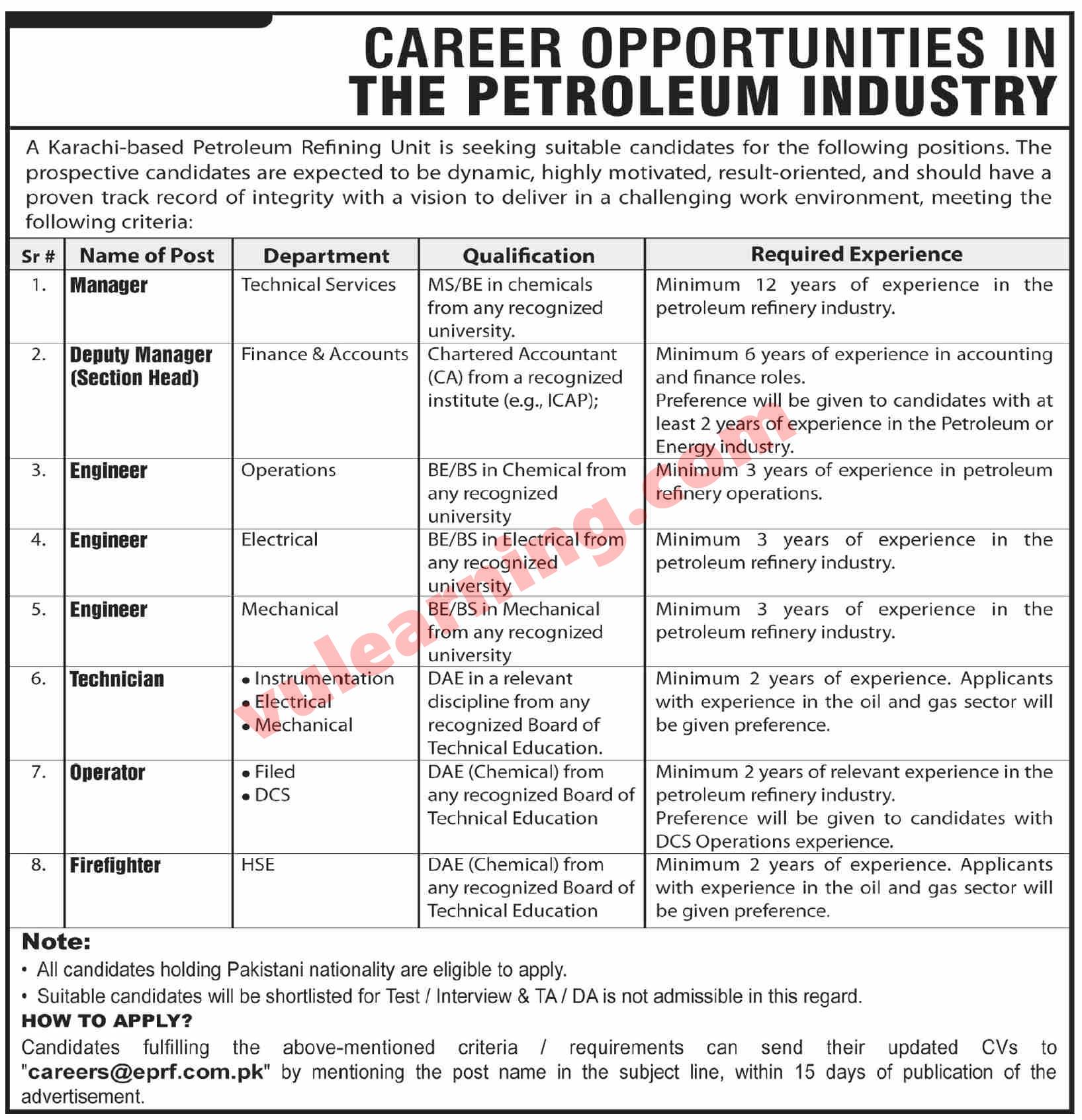 ENAR Petroleum Refining Facility Karachi Jobs 2026 for Engineers, Technicians & Others EPRF Latest Job Ad shown on this page is taken from Dawn Newspaper on 04-01-2026