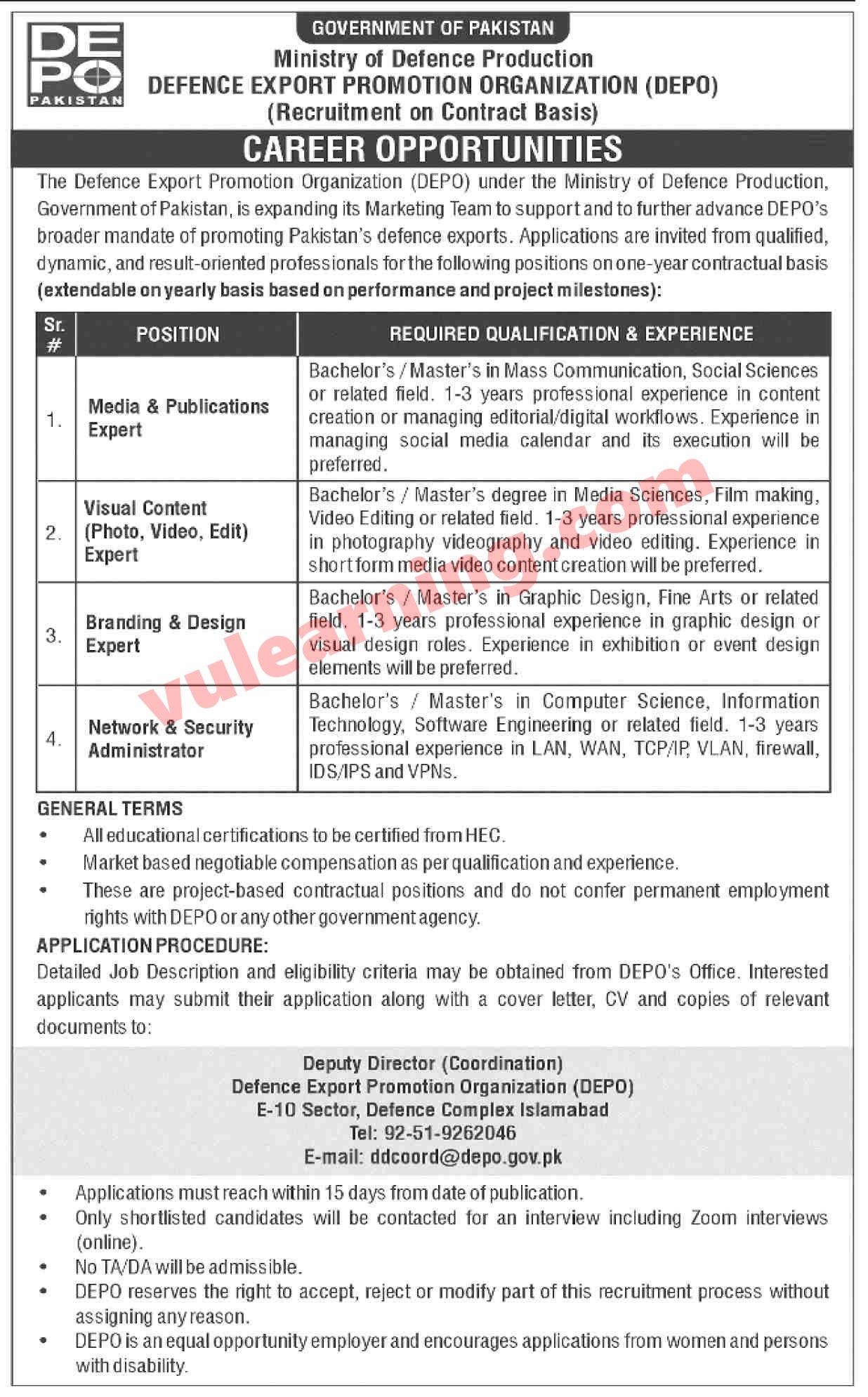 Defence Export Promotion Organization Islamabad Jobs 2026 for Network / Security Administrator & Others DEPO Latest Job Ad shown on this page is taken from Dawn Newspaper on 04-01-2026