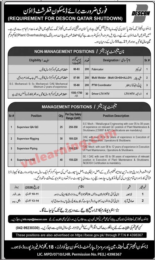 DESCON Engineering Qatar Shutdown Jobs 2026 for Fabricators, Welders & Others for Pakistanis Job Ad shown on this page is taken from Jang Newspaper on 04-01-2026