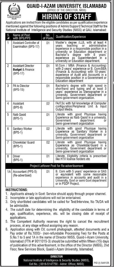 Advertisement of Quaid e Azam University Islamabad Jobs 2026 for Assistants, Chowkidar / Guards & Others QAU Latest-295440