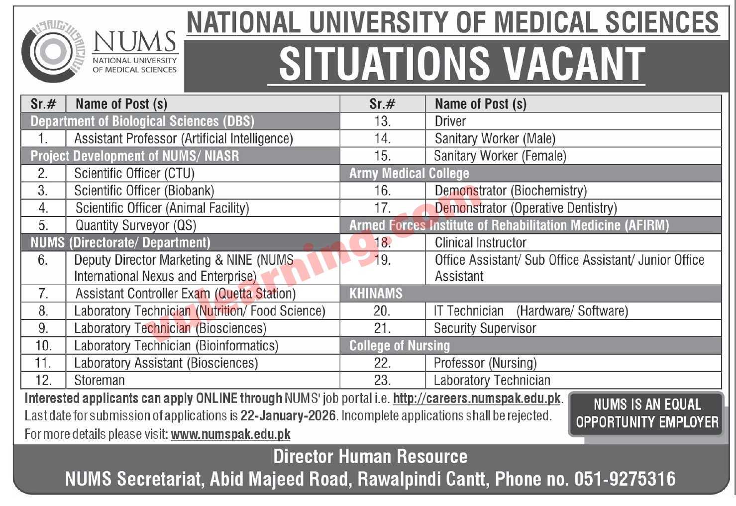 NUMS Jobs 2026 for Scientific Officers, Lab Technicians, Assistants & Others Apply Online Job Ad shown on this page is taken from Express Newspaper on 04-01-2026