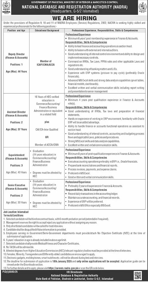 NADRA Jobs 2026 Apply Online Assistant Directors, Superintendents, Sr Executives & Others Latest Job Ad shown on this page is taken from Jang Newspaper on 04-01-2026