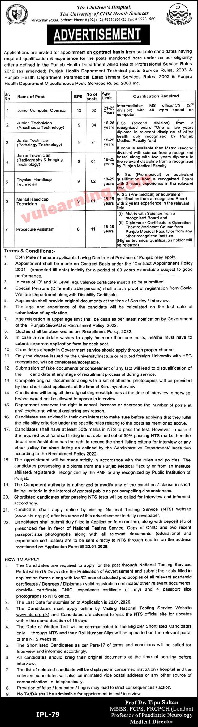 Advertisement of Children’s Hospital Lahore Jobs 2026 for Jr Technicians, Assistant, Jr Computer Operators & Others-295463