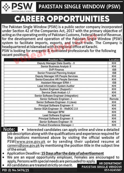Advertisement of Pakistan Single Window PSW Jobs 2026 Apply Online Pakistan Customs Federal Board of Revenue FBR-295466