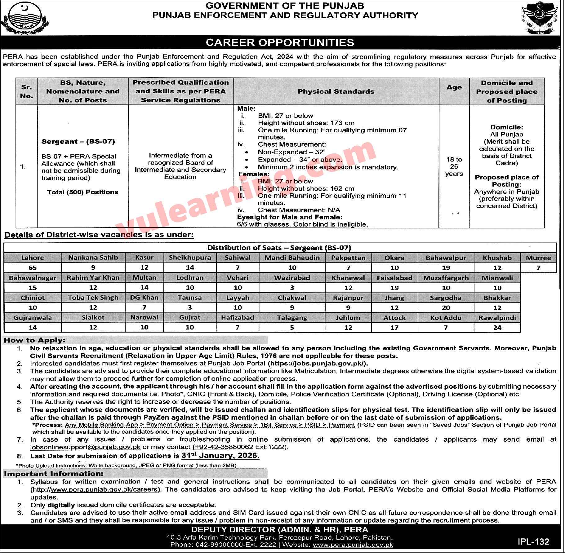 PERA Jobs 2026 Apply Online for 500 Sergeant BPS-07 For Males & Females Job Ad shown on this page is taken from Express Newspaper on 07-01-2026