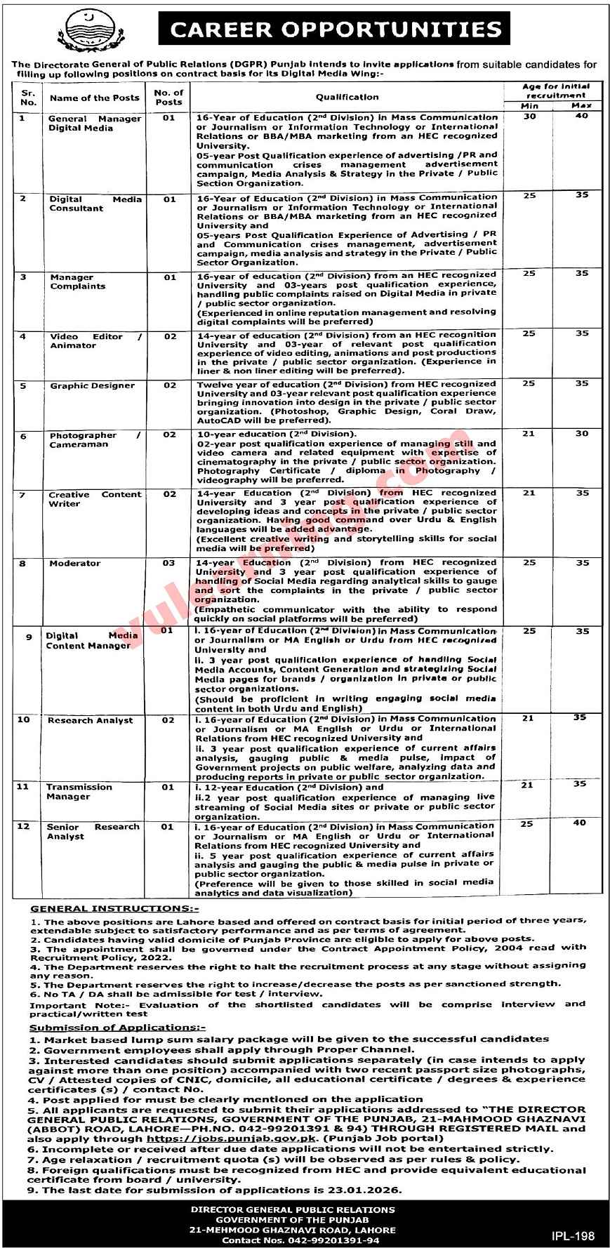 Advertisement of Directorate General of Public Relations (DGPR) Punjab Jobs 2026 Apply Online for Digital Media Wing in Lahore-295471