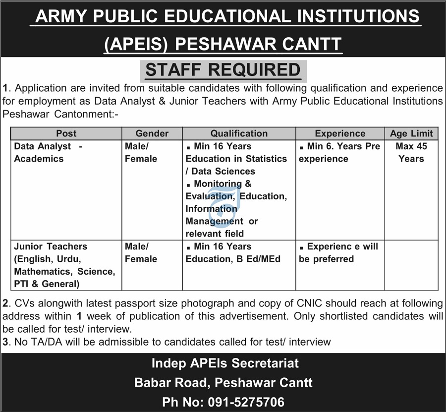 Advertisement of Army Public Educational Institutions (APEIS) Peshawar Cantt Jobs 2026 for Teaching & Non-Teaching Staff-295479