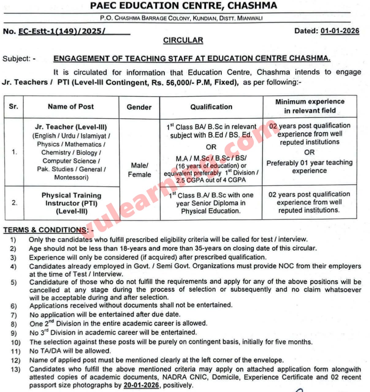 PAEC Education Centre Chashma Jobs 2026 for Males & Females Advertisement Job Ad shown on this page is taken from Not in Newspaper Newspaper on 07-01-2026