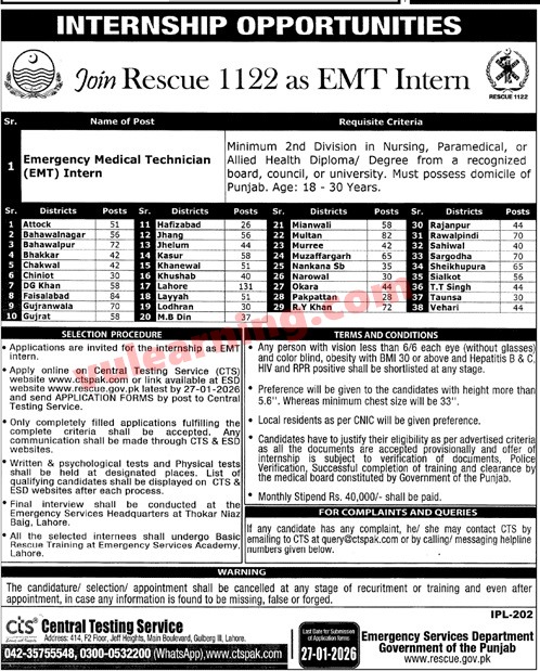 Rescue 1122 Jobs 2026 Apply Online Internship Program | Join Rescue 1122 as EMT Intern Job Ad shown on this page is taken from Jang Newspaper on 08-01-2026