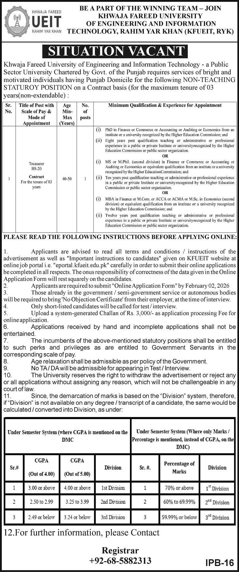 Advertisement of Khawaja Fareed UEIT Rahimyar Khan Jobs 2026 Apply Online for Treasurer -295500