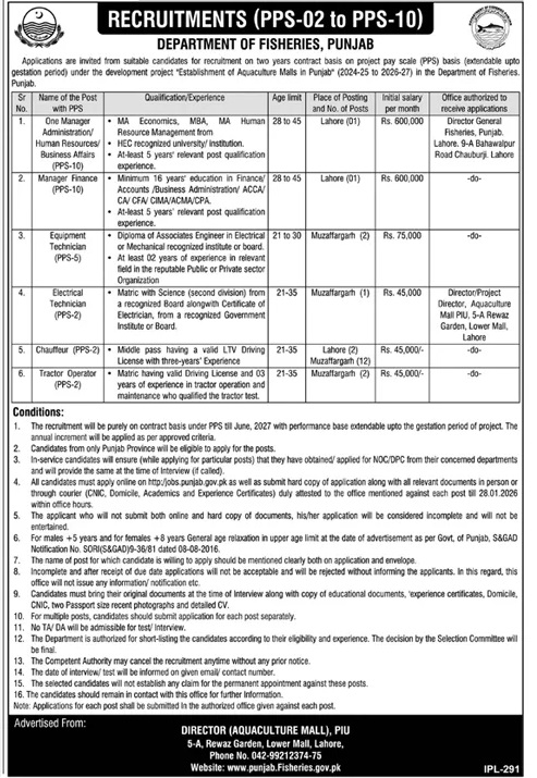 Advertisement of Fisheries Department Punjab Govt Jobs 2026 Apply Online for Drivers, Managers, Technicians & Others-295503