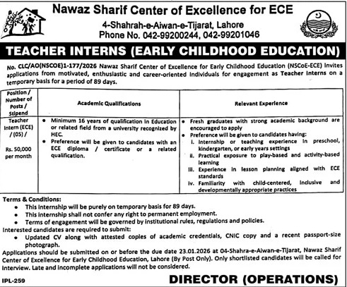 Nawaz Sharif Center of Excellence for Early Childhood Education Lahore Jobs 2026 for Teacher Interns Job Ad shown on this page is taken from Jang Newspaper on 09-01-2026