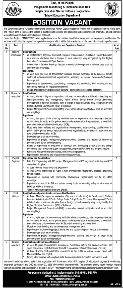 Punjab School Education Department Jobs 2026 Punjab Education Sector Reforms Programme Job Ad shown on this page is taken from Jang Newspaper on 10-01-2026