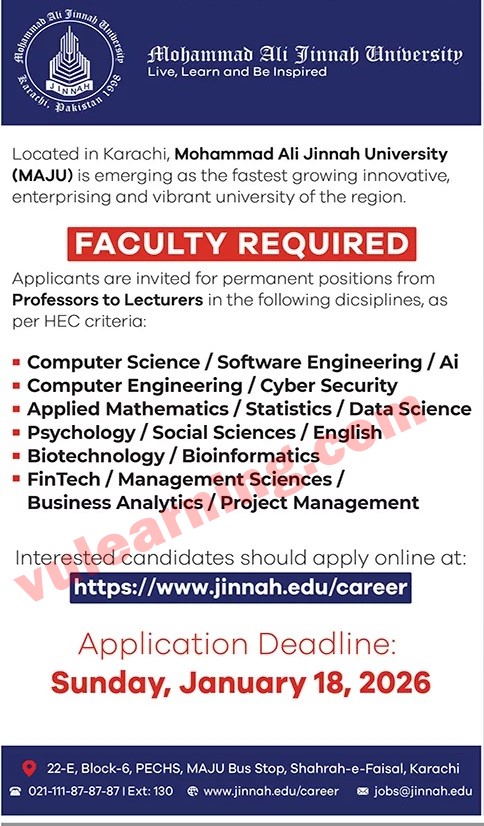 Mohammad Ali Jinnah University MAJU Karachi Jobs 2026 Apply Online for Lecturers to Professors Job Ad shown on this page is taken from Jang Newspaper on 11-01-2026