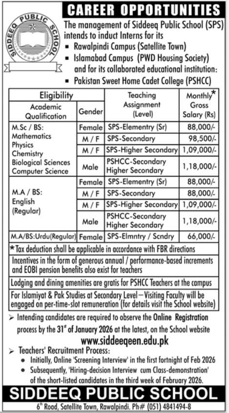 Advertisement of Siddeeq Public School Jobs 2026 for Male & Female Teachers in Islamabad / Rawalpindi-295554
