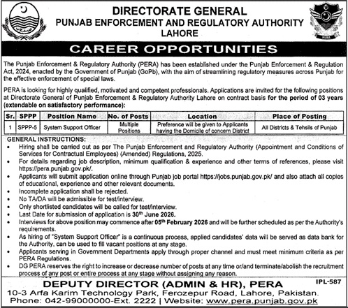 Advertisement of PERA Jobs 2026 for System Support Officers Apply Online Punjab Enforcement & Regulatory Authority Latest-295568