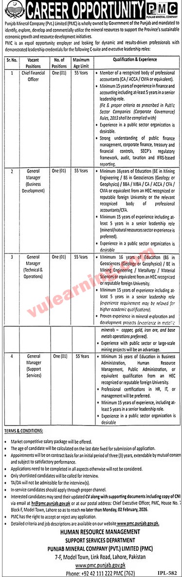 Advertisement of Punjab Mineral Company (Pvt.) Limited (PMC) Jobs 2026 for Managers & Others-295570