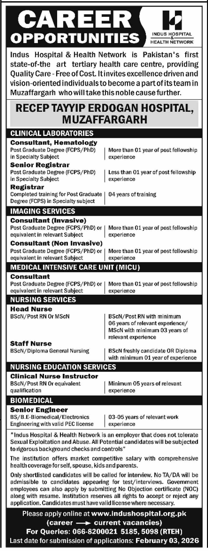 Indus Hospital Muzaffargarh Jobs 2026 Apply Online Recep Tayyip Erdogan Hospital Job Ad shown on this page is taken from Dawn Newspaper on 25-01-2026