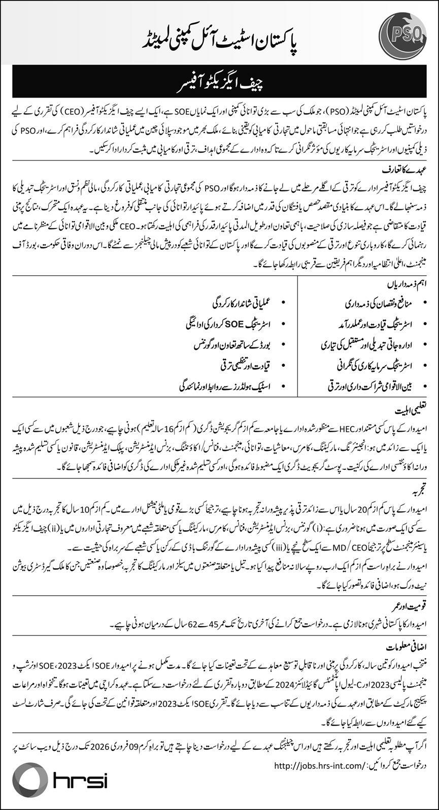 Pakistan State Oil Company Ltd Jobs 2026 for Chief Executive Officer (CEO) PSO Apply Online Job Ad shown on this page is taken from Express Newspaper on 25-01-2026