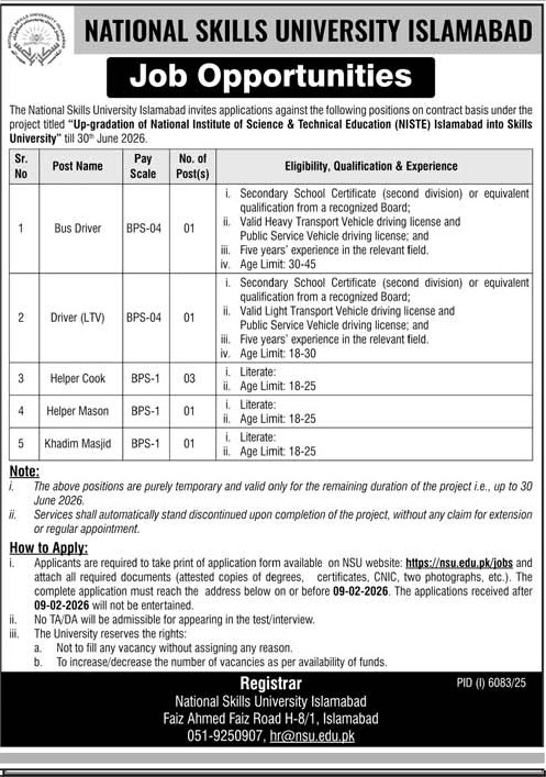 Advertisement of National Skills University (NSU) Islamabad Jobs 2026 for Drivers, Cooks & Others-295608