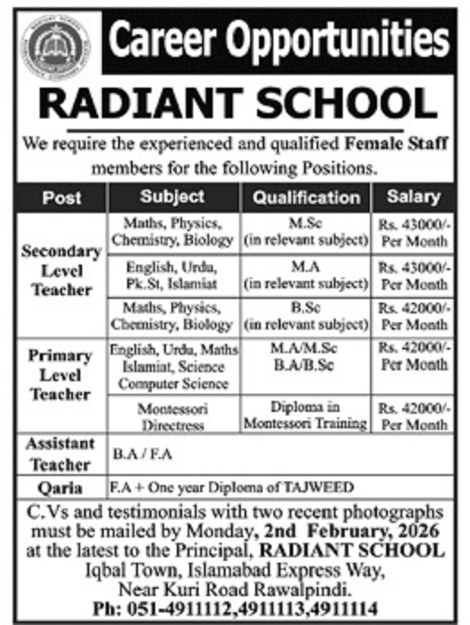 Radiant School Rawalpindi Jobs 2026 for Primary / Secondary Teachers, Assistant Teachers & Qaria Job Ad shown on this page is taken from Jang Newspaper on 25-01-2026