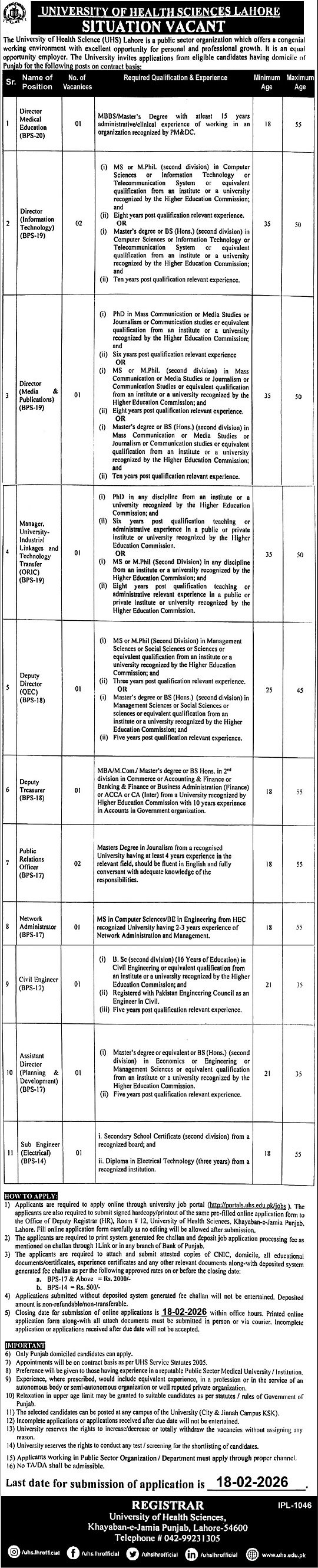 University of Health Sciences UHS Lahore Jobs 2026 Apply Online Job Ad shown on this page is taken from Nawa-e-waqt Newspaper on 30-01-2026