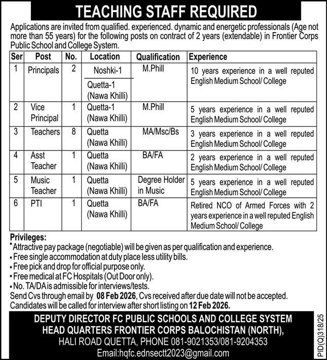 Advertisement of Frontier Corps Public School and College System Jobs 2026 for Teaching & Non-Teaching Staff-295660