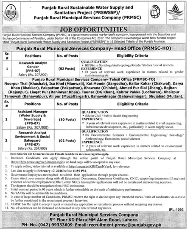 Punjab Rural Municipal Services Company PRMSC 2026 Jobs 2026 for Assistant Managers & Research Analysts Job Ad shown on this page is taken from Jang Newspaper on 30-01-2026
