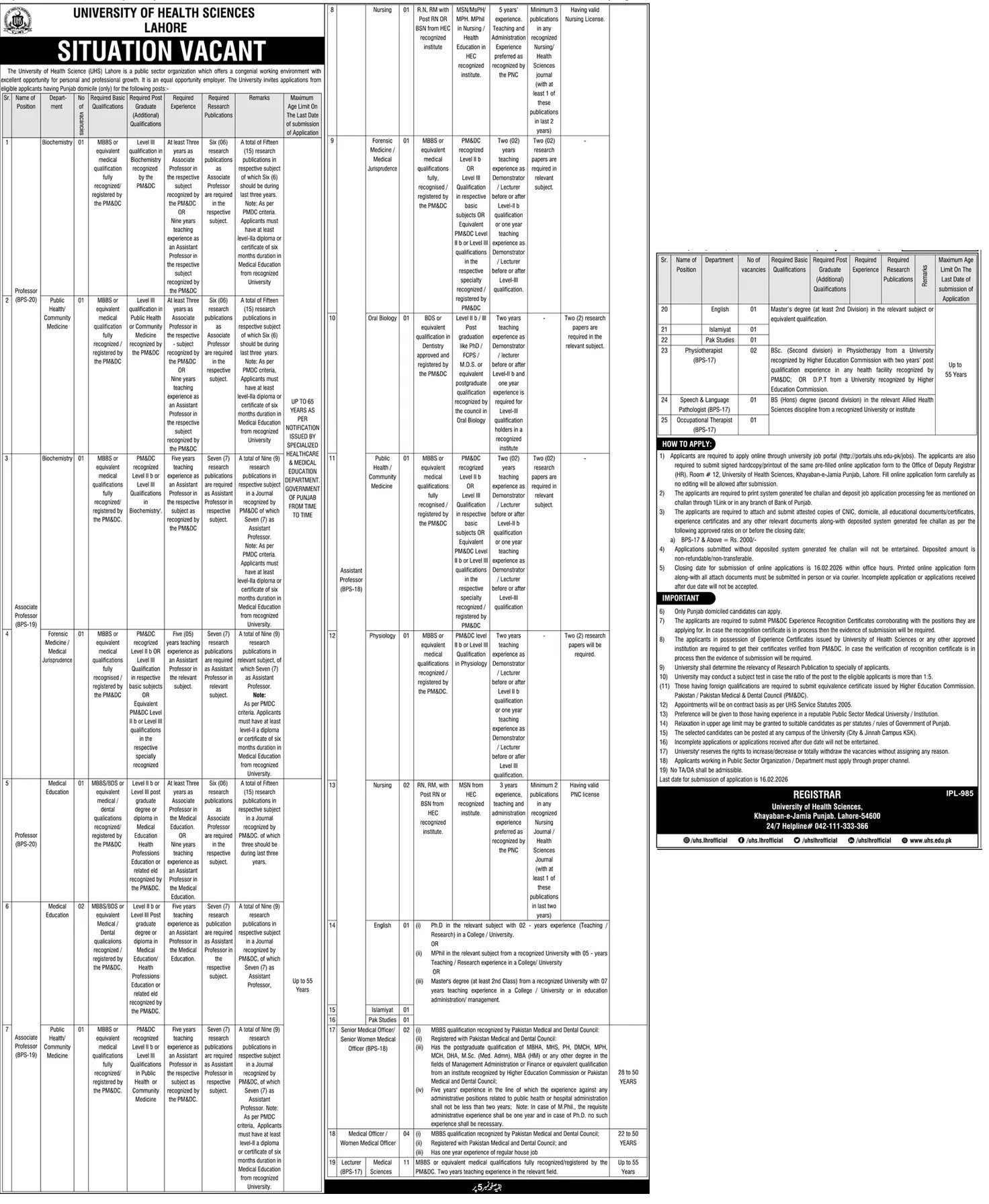 Advertisement of UHS Lahore Jobs 2026 for Teaching Faculty & Non-Teaching Staff University of Health Sciences Apply Online-295677