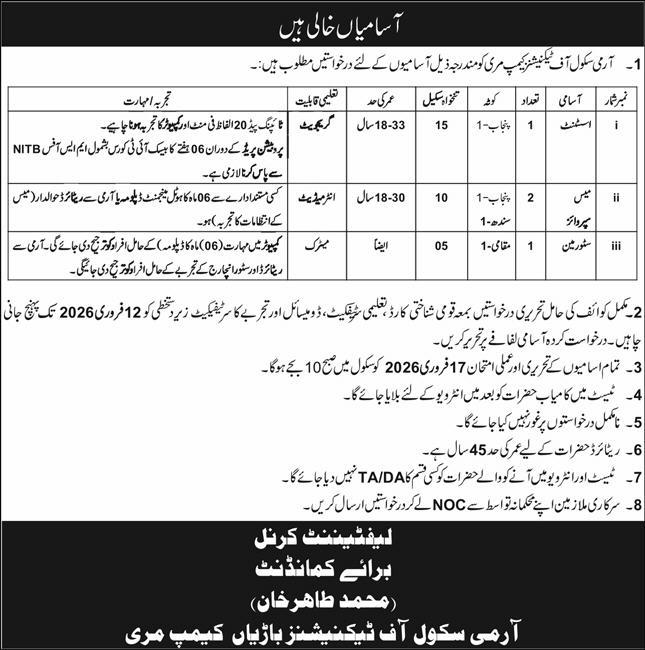 Advertisement of Army School of Technicians Camp Murree Jobs 2026 for Mess Supervisors, Assistant & Storeman-295678