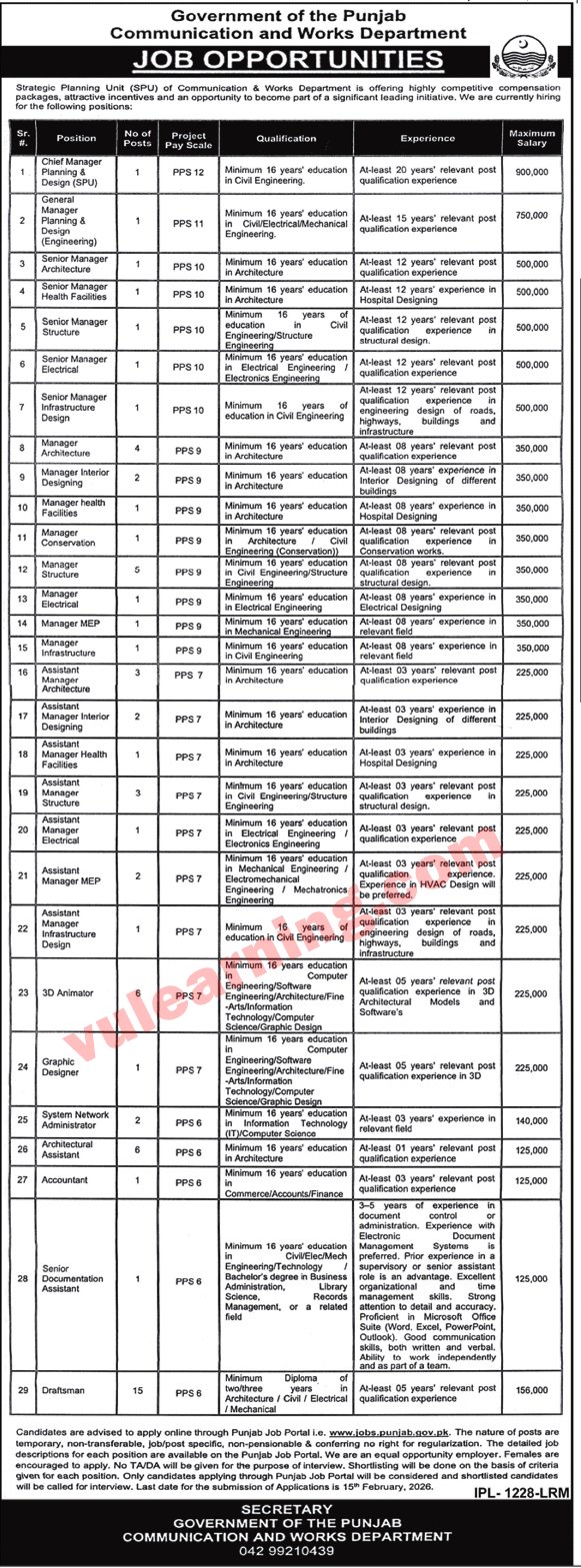 Communication and Works Department Punjab Jobs 2026 Apply Online for Assistant Managers, Draftsman & Others Job Ad shown on this page is taken from Jang Newspaper on 01-02-2026