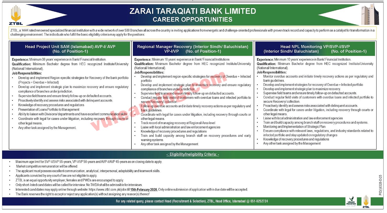 ZTBL Jobs 2026 Apply Online Zarai Taraqiati Bank Limited Advertisement Latest Job Ad shown on this page is taken from Express Newspaper on 01-02-2026