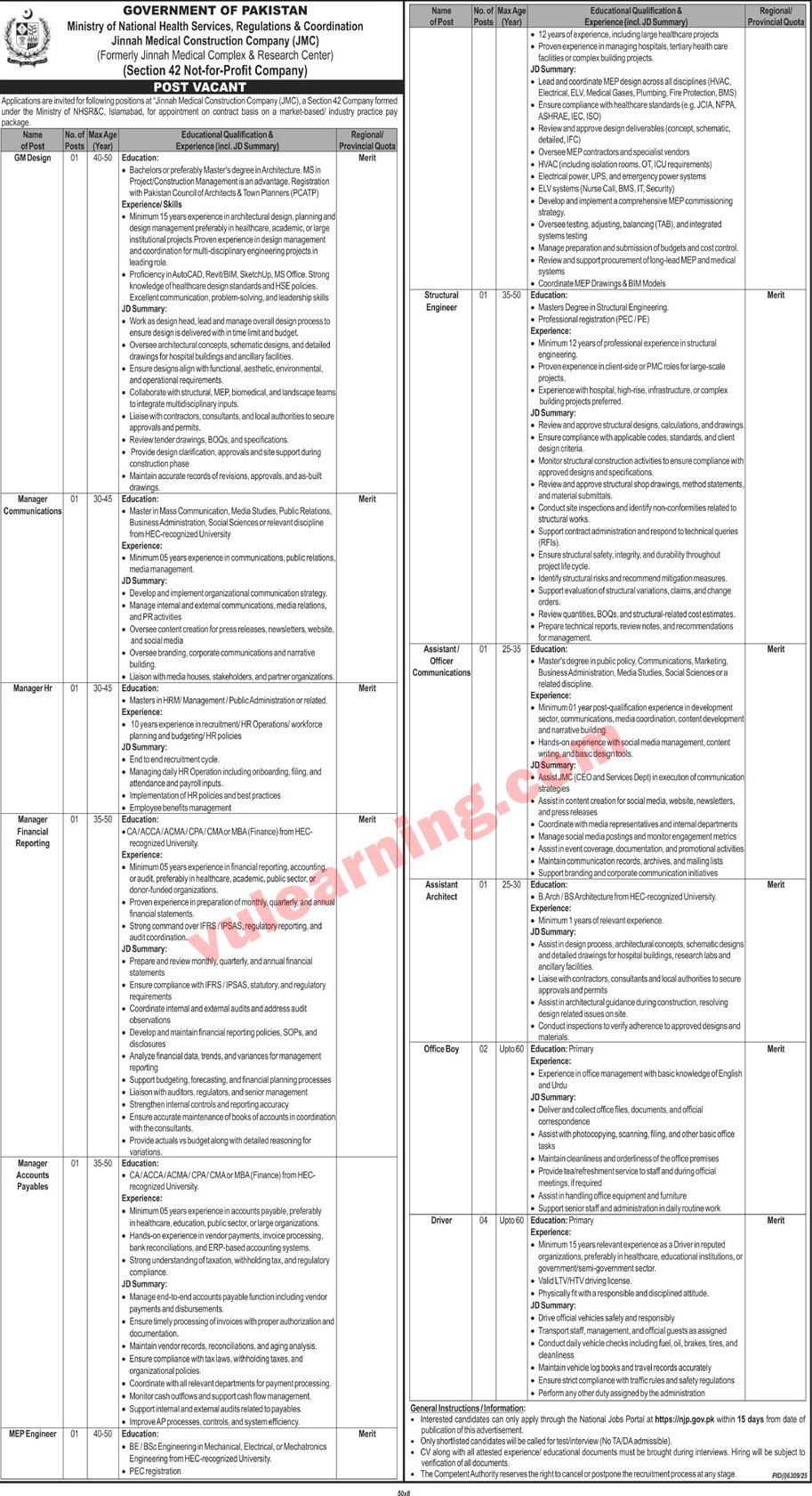 Advertisement of Jinnah Medical Construction Company Islamabad Jobs 2026 Apply Online JMC MNHSR&C Latest-295699
