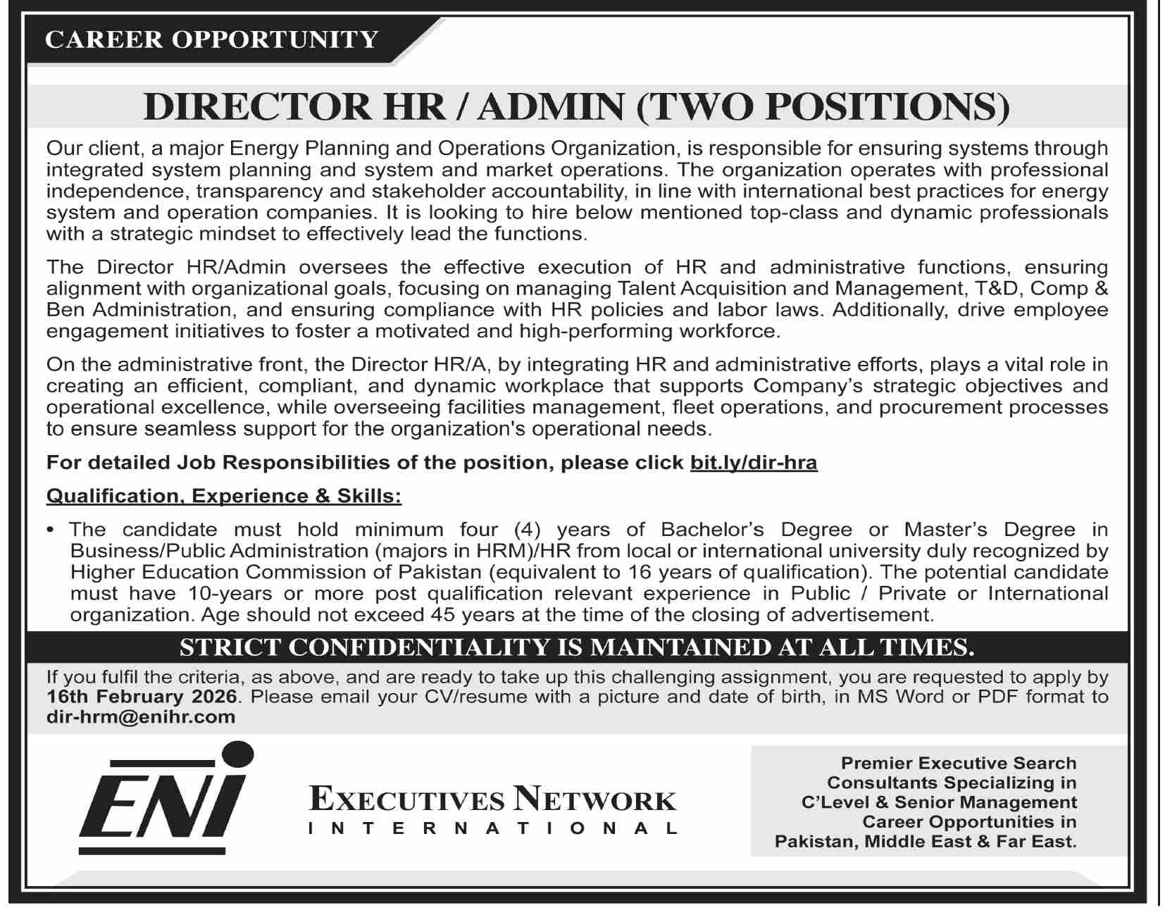Energy Planning and Operations Organization Jobs 2026 Apply Online Via ENI Job Ad shown on this page is taken from Dawn Newspaper on 01-02-2026