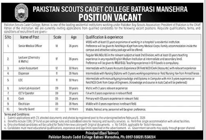 Pakistan Scouts Cadet College Batrasi Mansehra Jobs 2026 for Clerks, Lecturer, Security Guards & Others Job Ad shown on this page is taken from Jang Newspaper on 01-02-2026