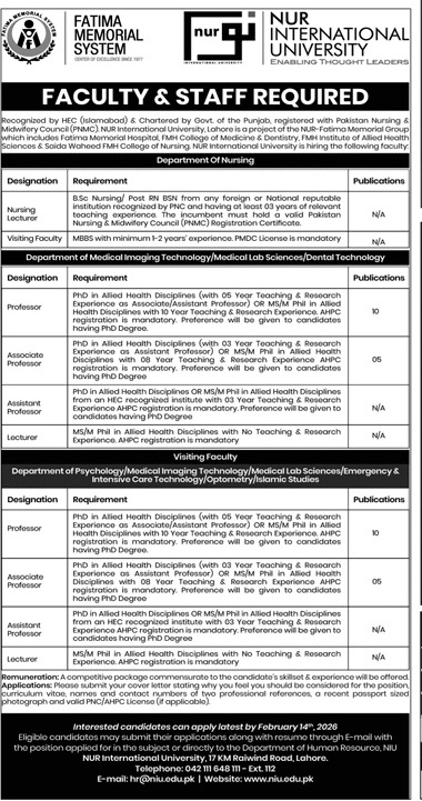 Nur International University Lahore Jobs 2026 for Lecturers, Assistant Professors & Others Job Ad shown on this page is taken from Jang Newspaper on 01-02-2026